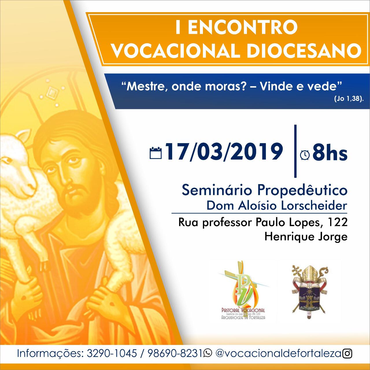 O primeiro encontro vocacional de 2019 será, portanto, no dia 17 de março (Domingo), e terá início às 8h, no Seminário Propedêutico que fica na Rua Professor Paulo Lopes, nº 122 – Bairro Henrique Jorge, vizinho a Igreja Matriz da Paróquia Imaculado Coração de Maria.