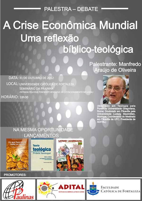 Acontecerá no dia 31 de outubro, às 18h30min, na Faculdade Católica de Fortaleza, no Seminário da Prainha em Fortaleza, Palestra e Debate com o tema “A Crise Econômica Mundial, uma reflexão bíblico-teológica” tendo como palestrante Pe. Manfredo Oliveira que tem Mestrado em Teologia pela Pontifícia Universidade Gregoriana, Roma; Doutorado em Filosofia pela Universidade Ludwig Maximilian, Munique; Coordenador do Mestrado em Filosofia da UFC; e Presidente da ADITAL. Na mesma ocasião acontecerá também o lançamento dos livros: “Eis que faço novas todas as coisas – Teologia apocalíptica”; “Teoria teológica Práxis teologal – sobre o método de Teologia da Libertação” e da Agenda Latino-Americana 2013. Informações pelo telefone (85) 3453 2150, na Faculdade Católica de Fortaleza ou na Livraria Paulinas pelo telefone (85) 3226 7544.