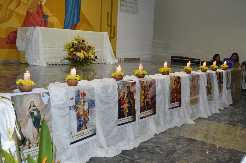 Em seguida foram convidados a compor a mesa solene de abertura da assembleia Dom José Antonio, presidente do Regional, Dom Ângelo Pignoli, vice- presidente, Dom Antônio Roberto Cavuto, secretário, Dom Edson Castro Homem, Bispo da Diocese de Iguatu, Ir. Rosália Alencar, secretária executiva, Pe. Manfredo Oliveira e Pe. Júnior Aquino, assessor do encontro.