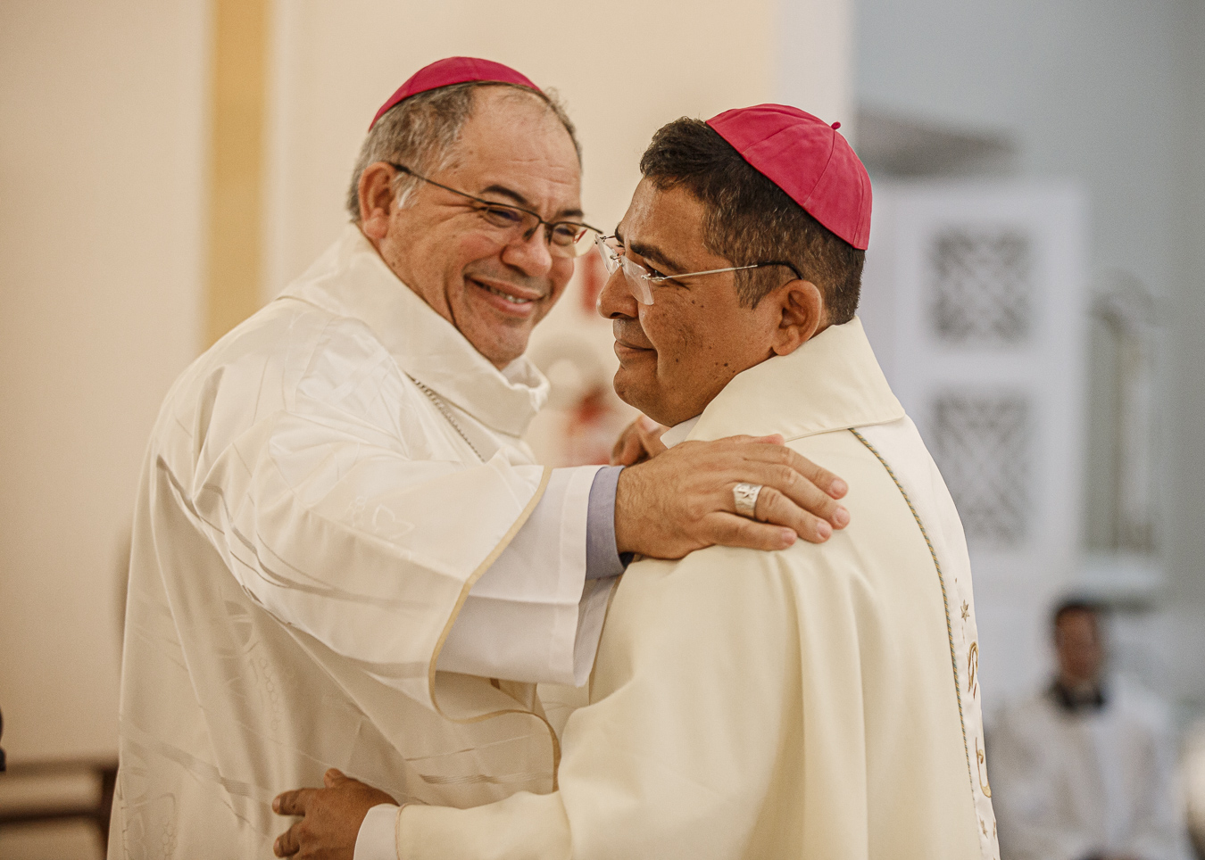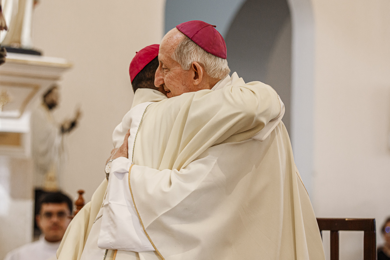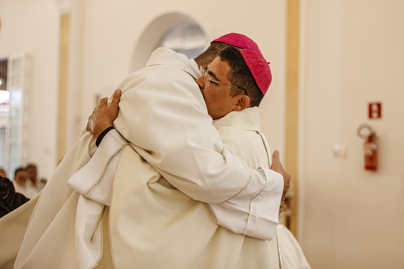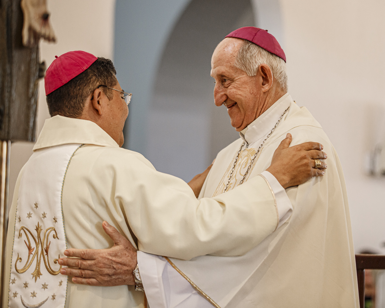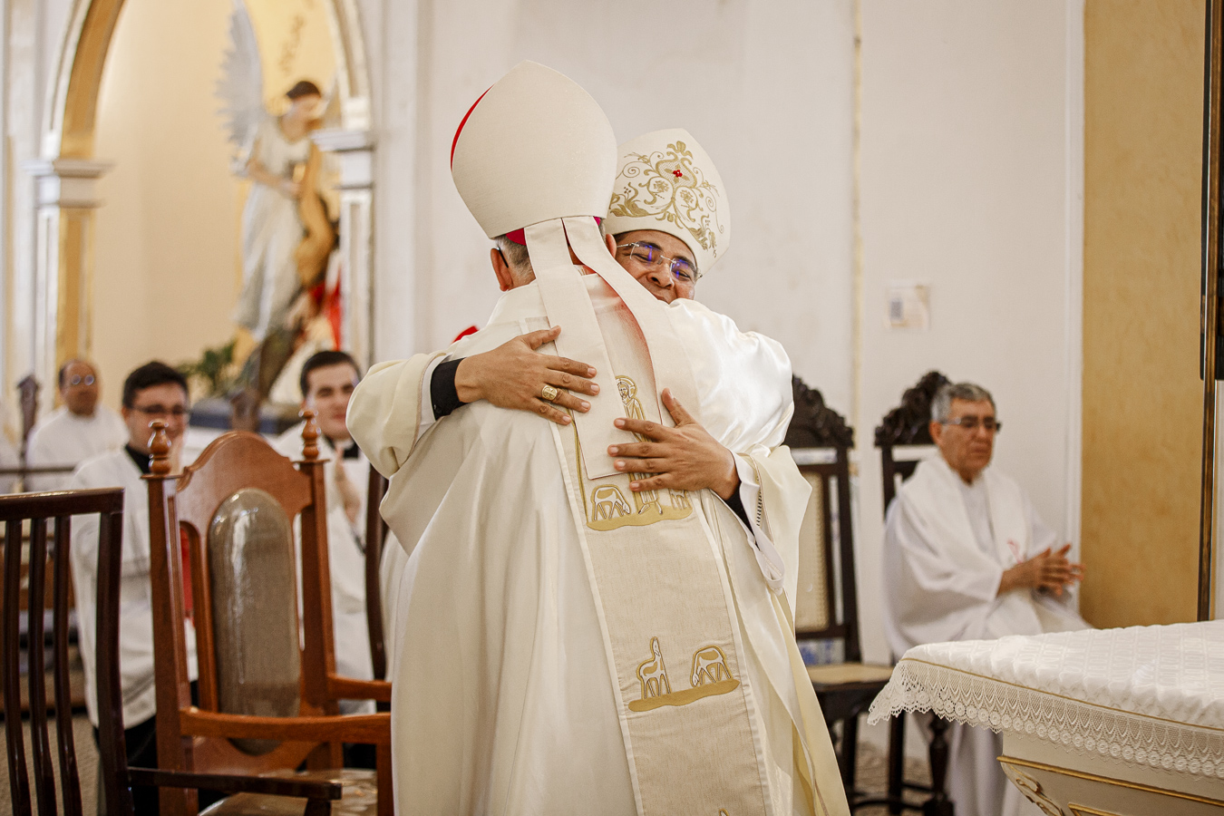 Dom Gregório Paixão, OSB, abraça dom Júlio César em gratidão por seu pastoreio na Arquidiocese de Fortaleza – Foto: Ta Hagia Fotografia.