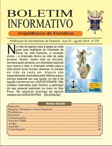 Início / Atualidades / Notícias / Fortaleza / [BOLETIM] Boletim Informativo … [BOLETIM] Boletim Informativo da Arquidiocese – agosto de 2014 18/08/2014 09:50 Clique no link abaixo para visualizar a publicação, em pdf boletim agosto de 2014 Fortaleza, Notícias boletim, Boletim Informativo