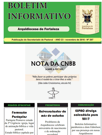 Início / Atualidades / Notícias / Fortaleza / Boletim Informativo da … Boletim Informativo da Arquidiocese de Fortaleza – Novembro de 2016 25/11/2016 17:38 Leia ou baixe do Boletim da Arquidiocese de Fortaleza, em PDF Visualize o Boletim Informativo da Arquidiocese de Fortaleza – pelo ISSUU Fortaleza, Notícias Arquidiocese de Fortaleza, Boletim Informativo
