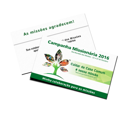 Envelopes para a coleta do Dia Mundial das Missões O envelope deve ser utilizado exclusivamente para a Coleta do Dia Mundial das Missões, feita nas celebrações do penúltimo final de semana de outubro (este ano, dias 22 e 23). As ofertas devem ser integralmente enviadas às Pontifícias Obras Missionárias (POM) que as repassam ao Fundo Universal de Solidariedade para apoiar projetos em todo o mundo. |