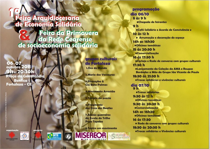 Informações com Isabel Cristina Forte, Técnica em Educação da Caritas Arquidiocesana de Fortaleza, através dos telefones (85) 8863. 3560 / 3388. 8716 ou Dona Cilene, da Associação de Mulheres Dendê Sol, no telefone (85) 8660. 9984.