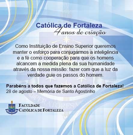 Na feliz Memória Litúrgica de Santo Agostinho de Hipona, Bispo e Doutor da Igreja, comemorado neste dia, 28 de agosto, a Faculdade Católica de Fortaleza – FCF também celebra quatro anos de sua criação, o que se deu pelo Decreto 004/2009 – Arquidiocese de Fortaleza, assinado por Dom José Antonio Aparecido Tosi Marques, Arcebispo de Fortaleza e também Chanceler da FCF.