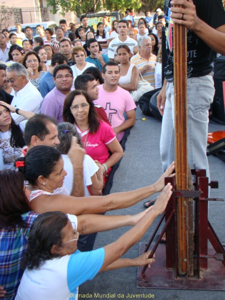 Saindo da Igreja, foram conduzidos para o patamar onde a fé popular assumiu a vez. Homens e mulheres detentores da experiência de quem construiu Caucaia tocaram os símbolos num clamor por uma juventude mais santa e feliz. Este povo de fé conduziu uma procissão percorrendo importantes e movimentadas ruas da cidade que acordava em meio aos louvores e o grito de ordem: “Morte de jovens nunca mais, queremos vida!”.