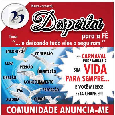 A Comunidade Católica Anuncia-me realizará um Carnaval diferente de 10 a 12 de fevereiro, com início às 14h encerrando com missa às 20h, na Rua Pe. Nóbrega, 461, no bairro Serrinha (próximo a UECE) o “Despertai” que tem como tema “Para Fé “…e deixando tudo eles o seguiram”. Durante o evento acontecerá confissão, encontro, perdão, oração, libertação aconselhamento, pregação, alegria, paz, louvor e também terão o Despertai Kids para as crianças. Informações pelo telefone (85) 3225 8494, na Comunidade Católica Anuncia-me.