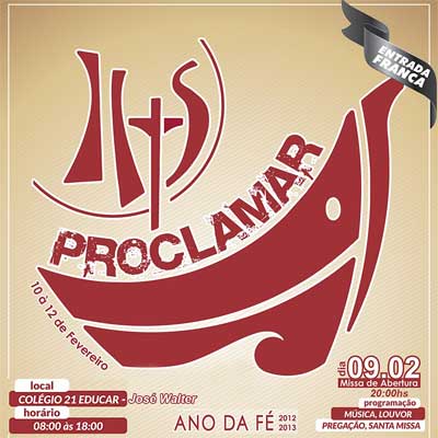 A Comunidade Católica Emanoel realizará de 10 a 12 de fevereiro, das 8h às 18h, no Colégio 21 Educar, no bairro José Walter, o “Proclamar”. Serão dias de retiro para quem quer passar um carnaval diferente com momentos de oração, louvor, pregação, missa, música. Dia 9 de fevereiro, às 19h, missa de abertura. Informações pelo telefone (85) 3291 1835, na Paróquia Santíssima Trindade, no bairro de José Walter.