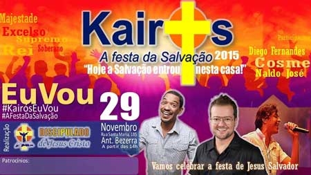 Kairós, a Festa da Salvação, é um evento promovido anualmente pelo Movimento Católico de Evangelização Discipulado de Jesus Cristo. É mais que uma festa, é um grande projeto de evangelização. Tem por fim celebrar a festa do Rei Jesus, o Salvador da humanidade, contemplando milhares de pessoas com louvor, orações, shows artísticos com o Ministério DJC, cantores renomados do meio católico e a Missa de Bênção com o Padre Marcos Oliveira. Acontecerá em Fortaleza, dia 29 de Novembro próximo, a partir das 14h, em frente ao Terminal do Antônio Bezerra.