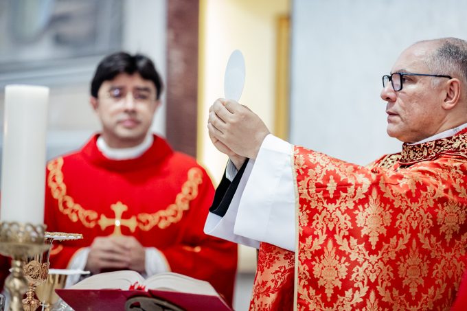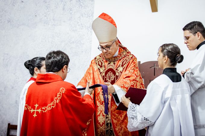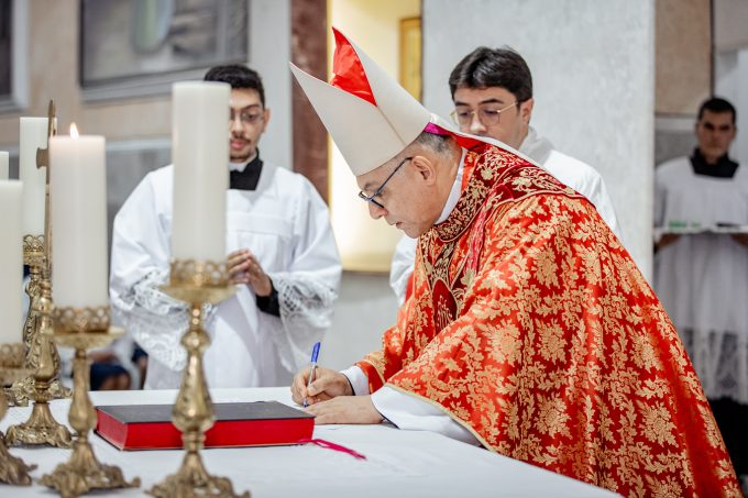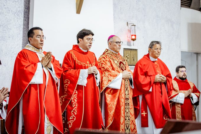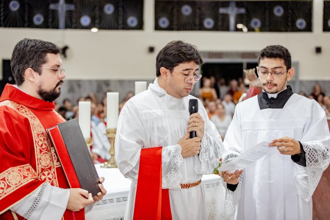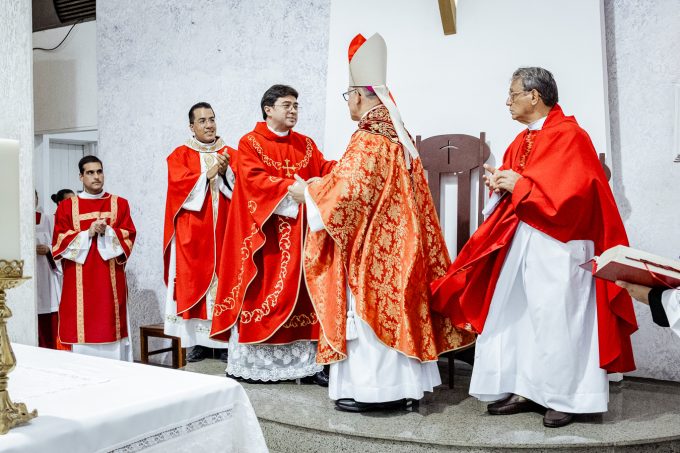 A cerimônia seguiu o rito tradicional de posse, no qual o novo pároco recebeu as vestes sacerdotais das mãos do arcebispo, gesto que simboliza a assunção plena de suas funções pastorais e o serviço que lhe é confiado pela Igreja. Durante o rito, após a Liturgia da Palavra, o Arcebispo entregou ao Padre Thiago o Livro dos Evangelhos, que ele recebeu com reverência e que representa o compromisso de anunciar o Evangelho com fidelidade. Em seguida, fez‑se a renovação das promessas sacerdotais, a profissão de fé e o juramento de fidelidade diante do arcebispo, tocando o Livro dos Evangelhos como sinal da entrega total ao ministério confiado.