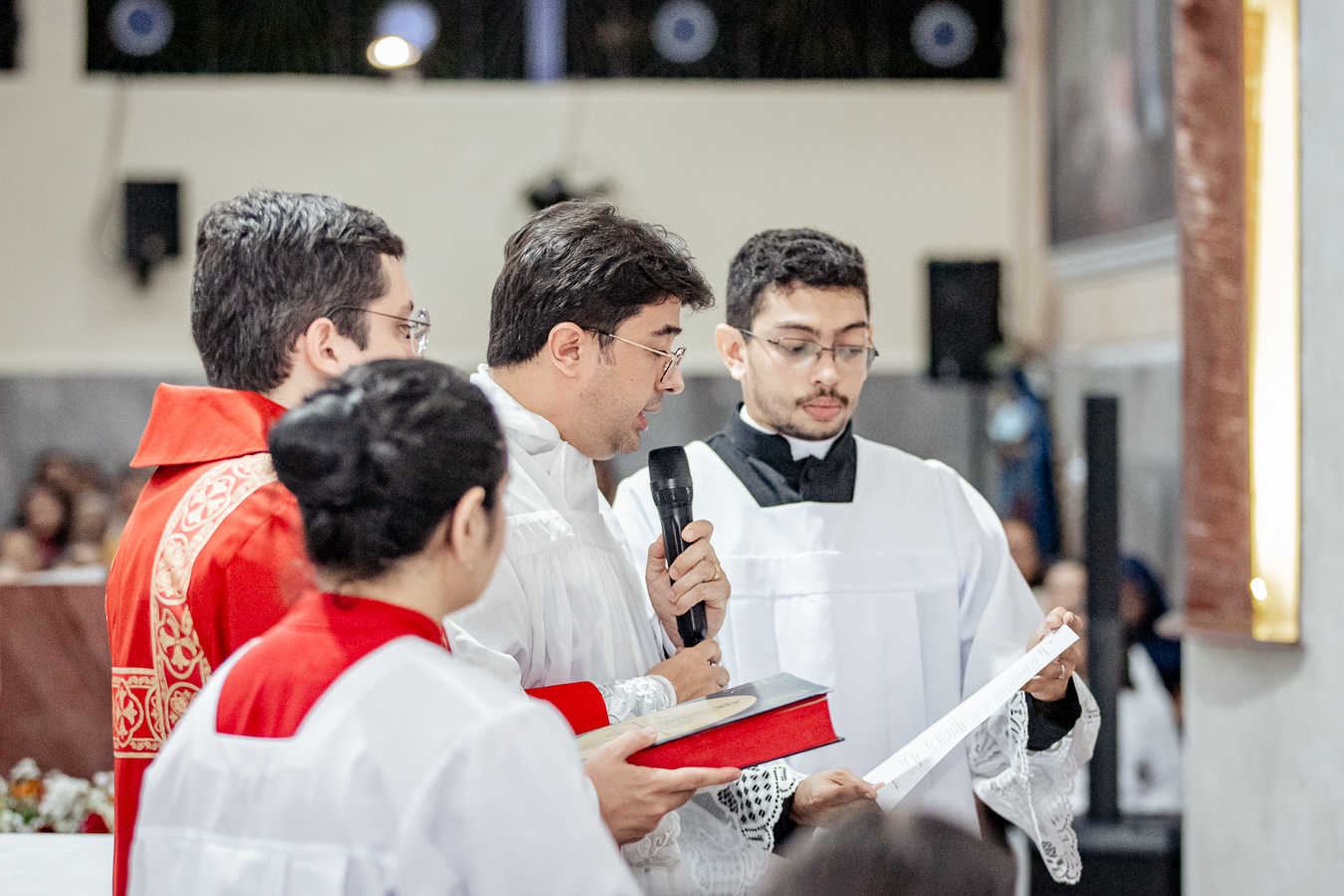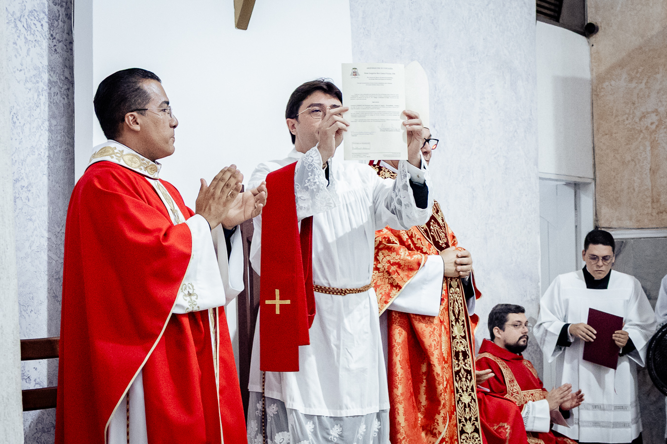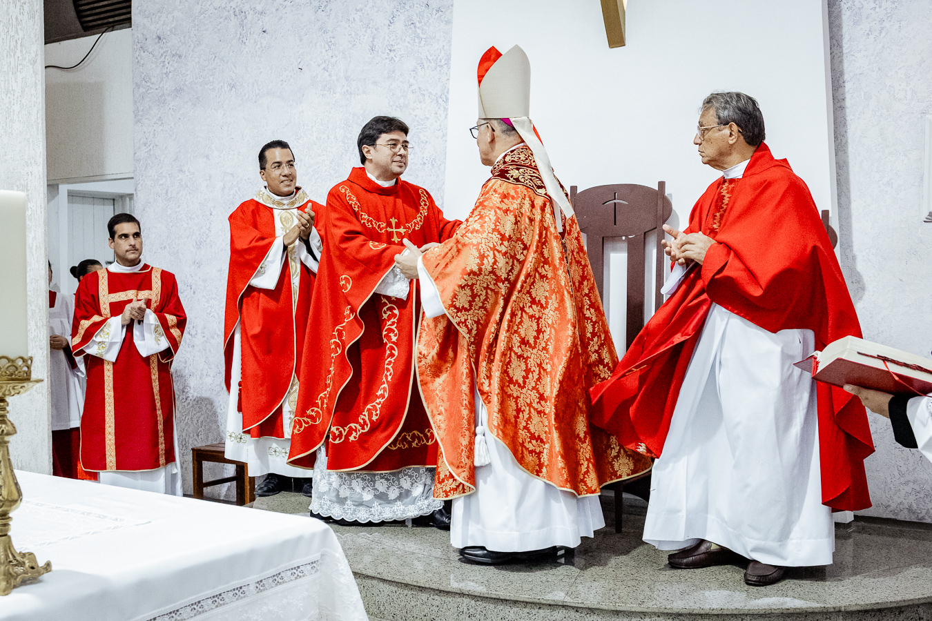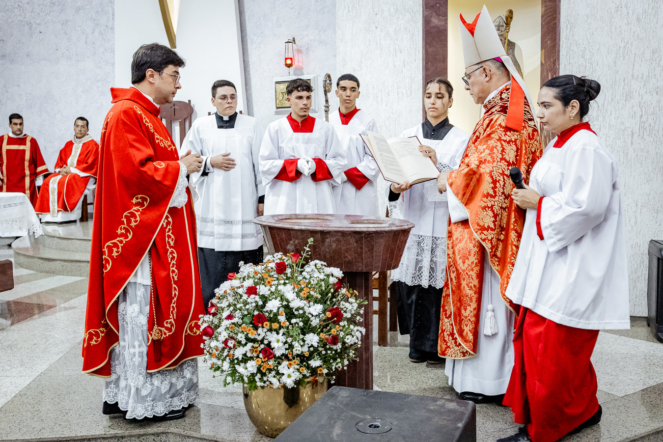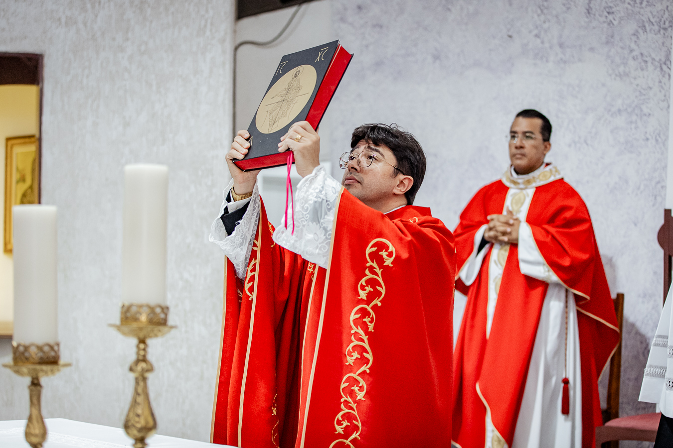 A cerimônia seguiu o rito tradicional de posse, no qual o novo pároco recebeu as vestes sacerdotais das mãos do arcebispo, gesto que simboliza a assunção plena de suas funções pastorais e o serviço que lhe é confiado pela Igreja. Durante o rito, após a Liturgia da Palavra, o Arcebispo entregou ao Padre Thiago o Livro dos Evangelhos, que ele recebeu com reverência e que representa o compromisso de anunciar o Evangelho com fidelidade. Em seguida, fez‑se a renovação das promessas sacerdotais, a profissão de fé e o juramento de fidelidade diante do arcebispo, tocando o Livro dos Evangelhos como sinal da entrega total ao ministério confiado.