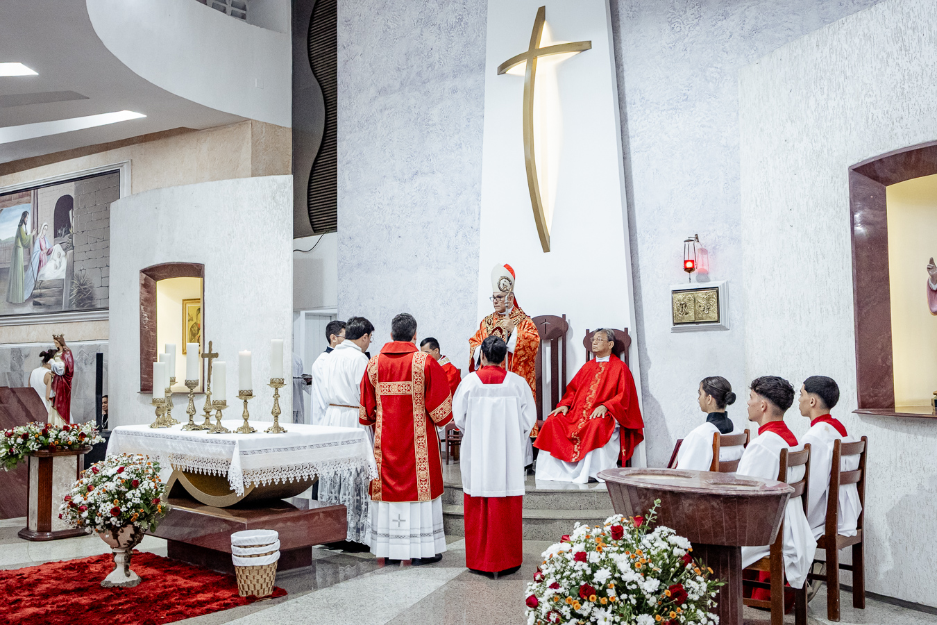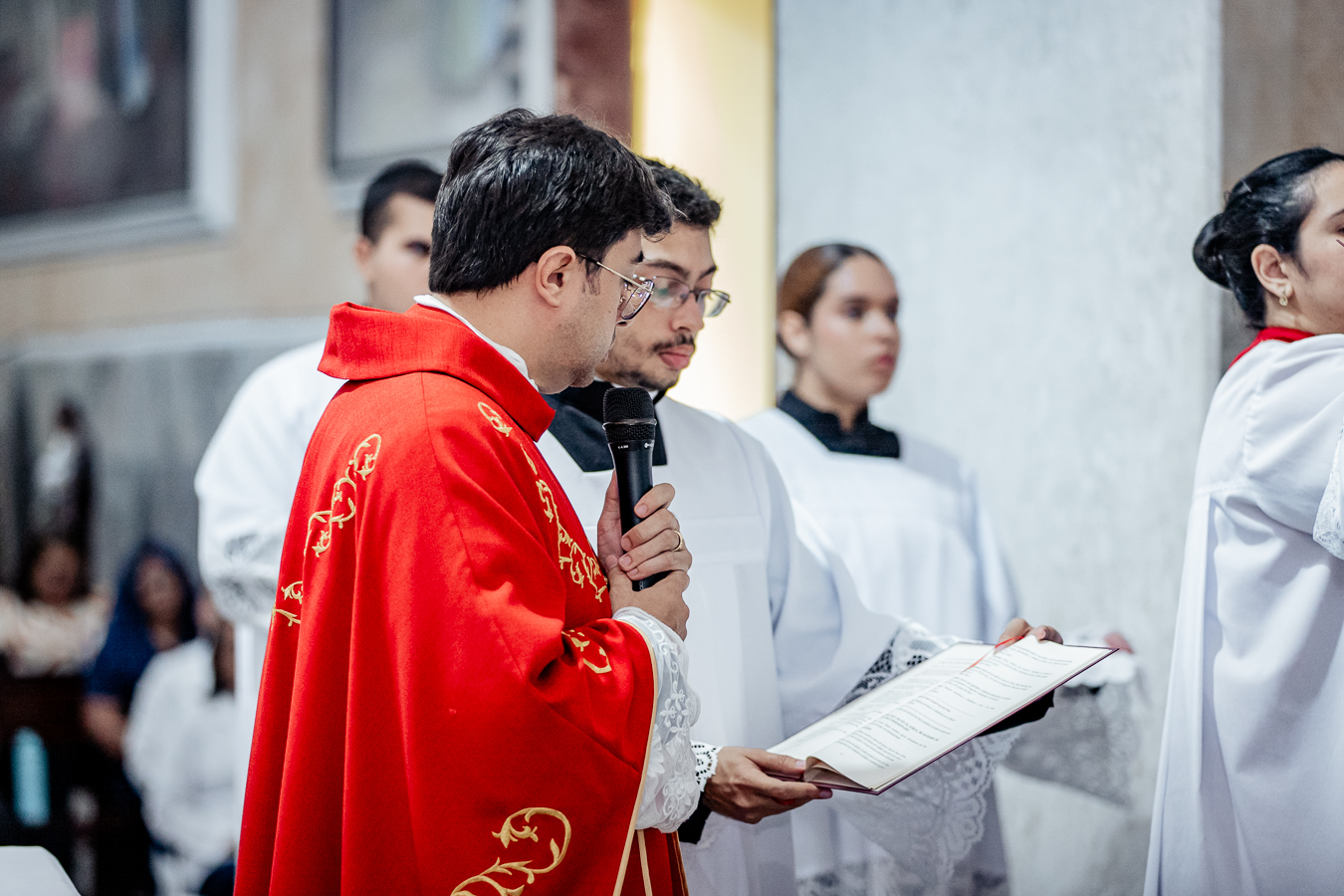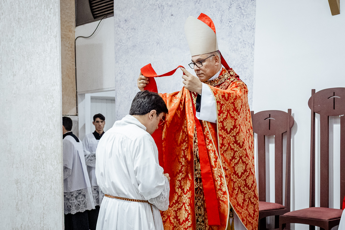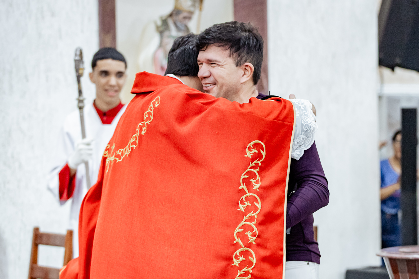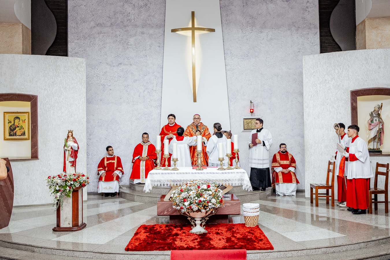 A cerimônia seguiu o rito tradicional de posse, no qual o novo pároco recebeu as vestes sacerdotais das mãos do arcebispo, gesto que simboliza a assunção plena de suas funções pastorais e o serviço que lhe é confiado pela Igreja. Durante o rito, após a Liturgia da Palavra, o Arcebispo entregou ao Padre Thiago o Livro dos Evangelhos, que ele recebeu com reverência e que representa o compromisso de anunciar o Evangelho com fidelidade. Em seguida, fez‑se a renovação das promessas sacerdotais, a profissão de fé e o juramento de fidelidade diante do arcebispo, tocando o Livro dos Evangelhos como sinal da entrega total ao ministério confiado.