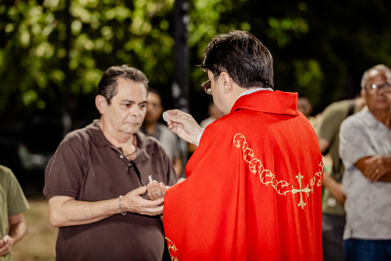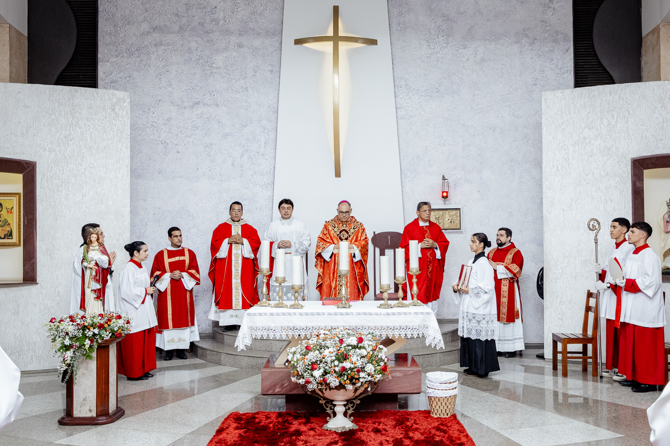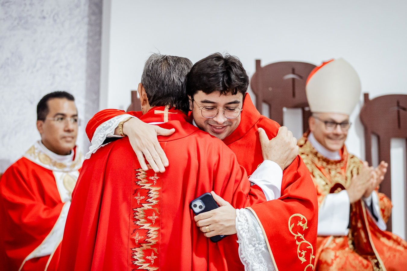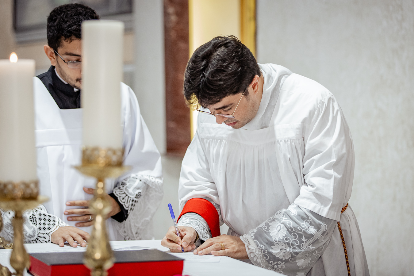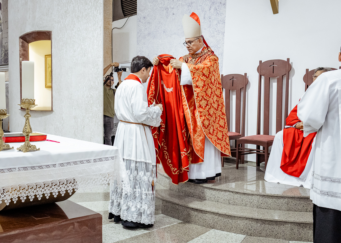 A cerimônia seguiu o rito tradicional de posse, no qual o novo pároco recebeu as vestes sacerdotais das mãos do arcebispo, gesto que simboliza a assunção plena de suas funções pastorais e o serviço que lhe é confiado pela Igreja. Durante o rito, após a Liturgia da Palavra, o Arcebispo entregou ao Padre Thiago o Livro dos Evangelhos, que ele recebeu com reverência e que representa o compromisso de anunciar o Evangelho com fidelidade. Em seguida, fez‑se a renovação das promessas sacerdotais, a profissão de fé e o juramento de fidelidade diante do arcebispo, tocando o Livro dos Evangelhos como sinal da entrega total ao ministério confiado.