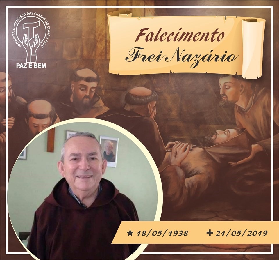 Comunicamos o falecimento de Frei Nazário (Ademar Oliveira de Souza), primeiro ministro provincial da Província do Ceará e Piauí, ocorrido hoje, dia 21 de maio, por volta das 8h da manhã, no Hospital Dom Walfrido, em Sobral-CE. O corpo será velado a partir das 16h no convento São Francisco. A missa de corpo presente será celebrada amanhã, 22 de maio, às 8h, no Santuário São Francisco e em seguida acontecerá o sepultamento no cemitério São Francisco, em Sobral.