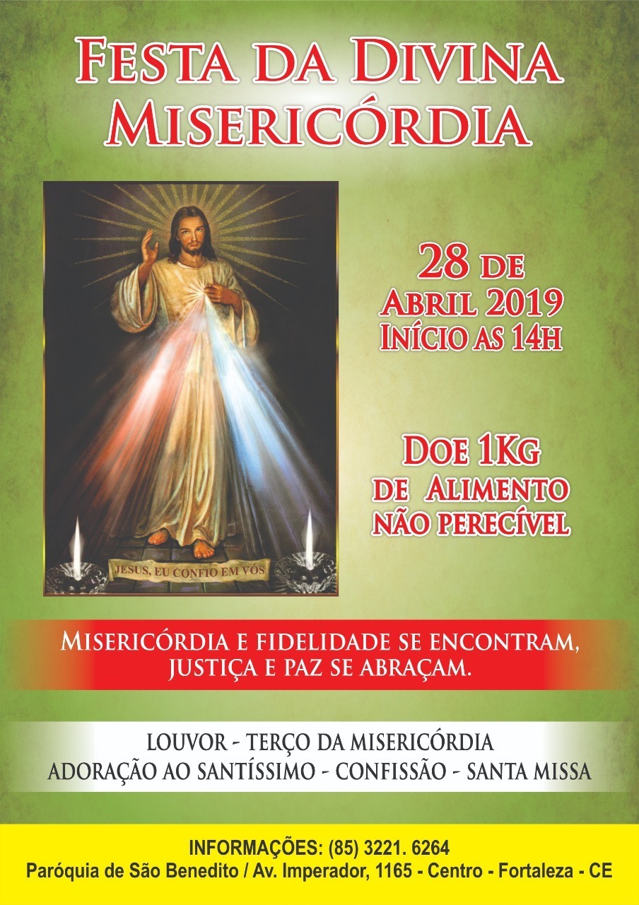 O Santuário e Paróquia de São Benedito realizará no dia 28/04, domingo, a Festa da Divina Misericórdia 2019, a partir das 14 horas. Neste ano o tema da festa será “Misericórdia e Fidelidade se Encontram, Justiça e Paz se Abraçam”. A programação contará com louvor, Terço da Misericórdia, Adoração ao Santíssimo Sacramento, Confissão e encerramento com a Santa Missa.