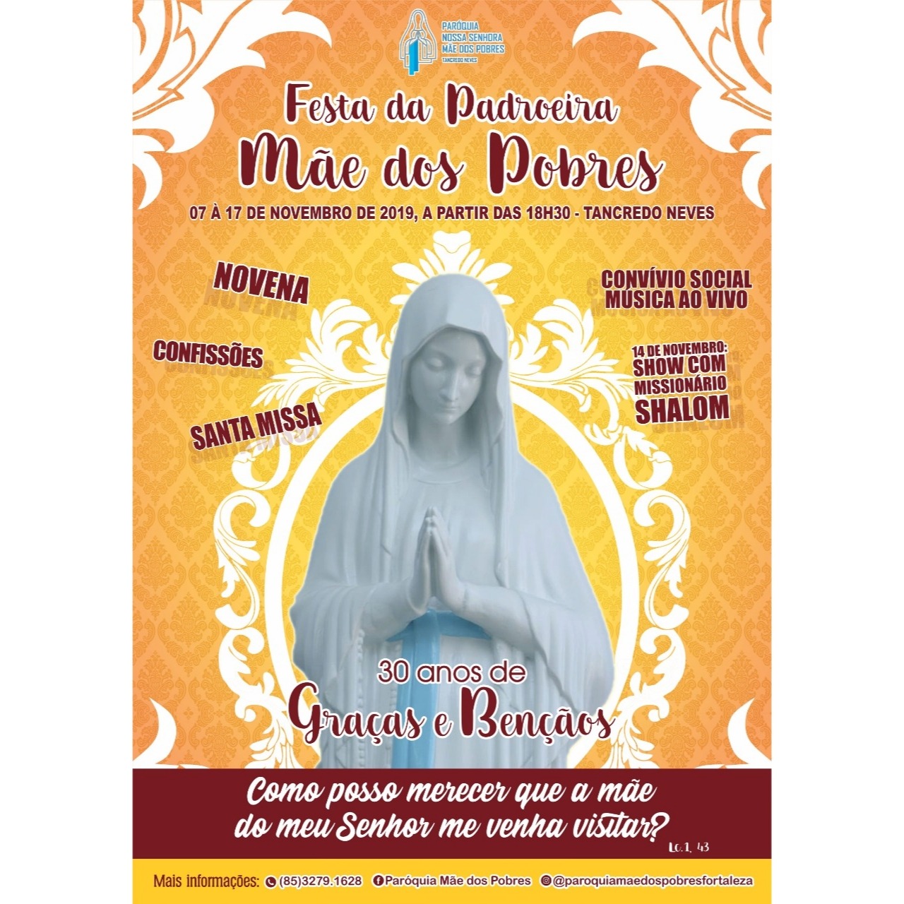 A Paróquia Nossa Senhora Mãe dos Pobres realiza de 07 a 17 de novembro, a festa de sua padroeira tendo como tema “Como posso merecer que a mãe do meu senhor venha me visitar?”. Para os paroquianos da Igreja Mãe dos Pobres esse ano é de alegria multiplicada por trinta, pois celebrarão os 30 anos da chegada da Imagem da Virgem Mãe dos Pobres na comunidade. São 30 anos de fé, devoção, bençãos e graças. Durante os festejos terço, novena, santa missa, convívio social e show. Informações pelo telefone (85) 32791628, na Secretaria.
