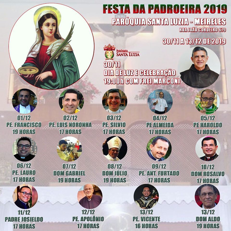 De 01 a 13 de dezembro acontece a Festa da Paróquia Santa Luzia, no bairro Meireles com a Trezena tendo como tema “Adoro a um só Deus verdadeiro e a Ele prometo amor e fidelidade” e o lema: “Serás liberto pelo direito e pela justiça”. (Is 1,27). Dia 30 de novembro, às 18h30 aconteceu abertura da festa no átrio da Igreja com acolhida a comunidade, hasteamento das bandeiras e às 19h, santa missa presidida pelo Frei Marconi.