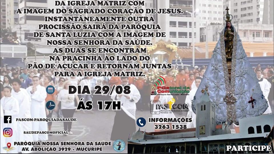 A Paróquia Nossa Senhora da Saúde fica Av. da Abolição, 3929 Mucuripe, Fortaleza – CE. Informações pelo telefone (85) 3263-1538, na Secretaria Paroquial.
