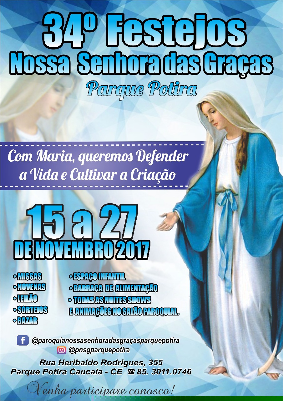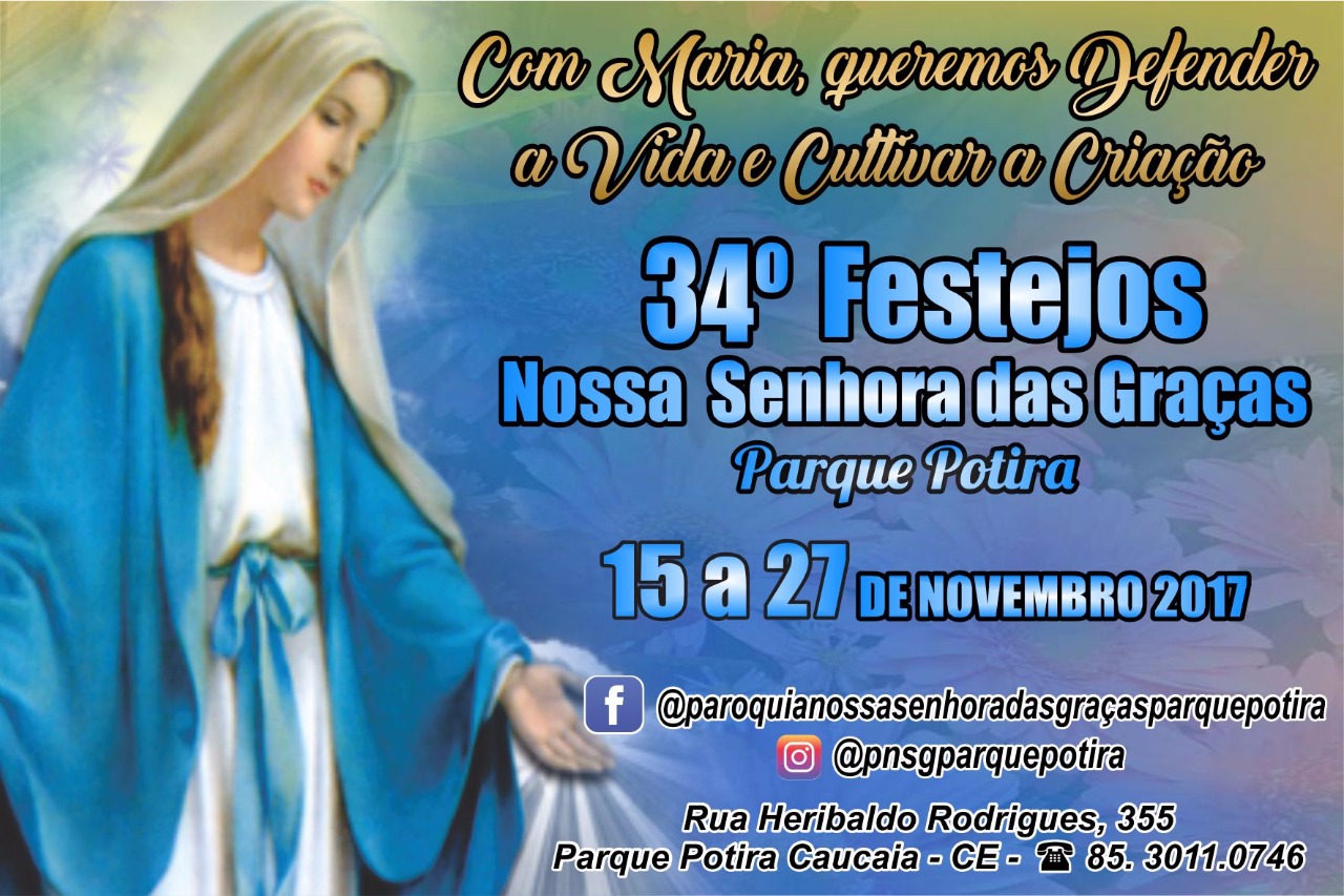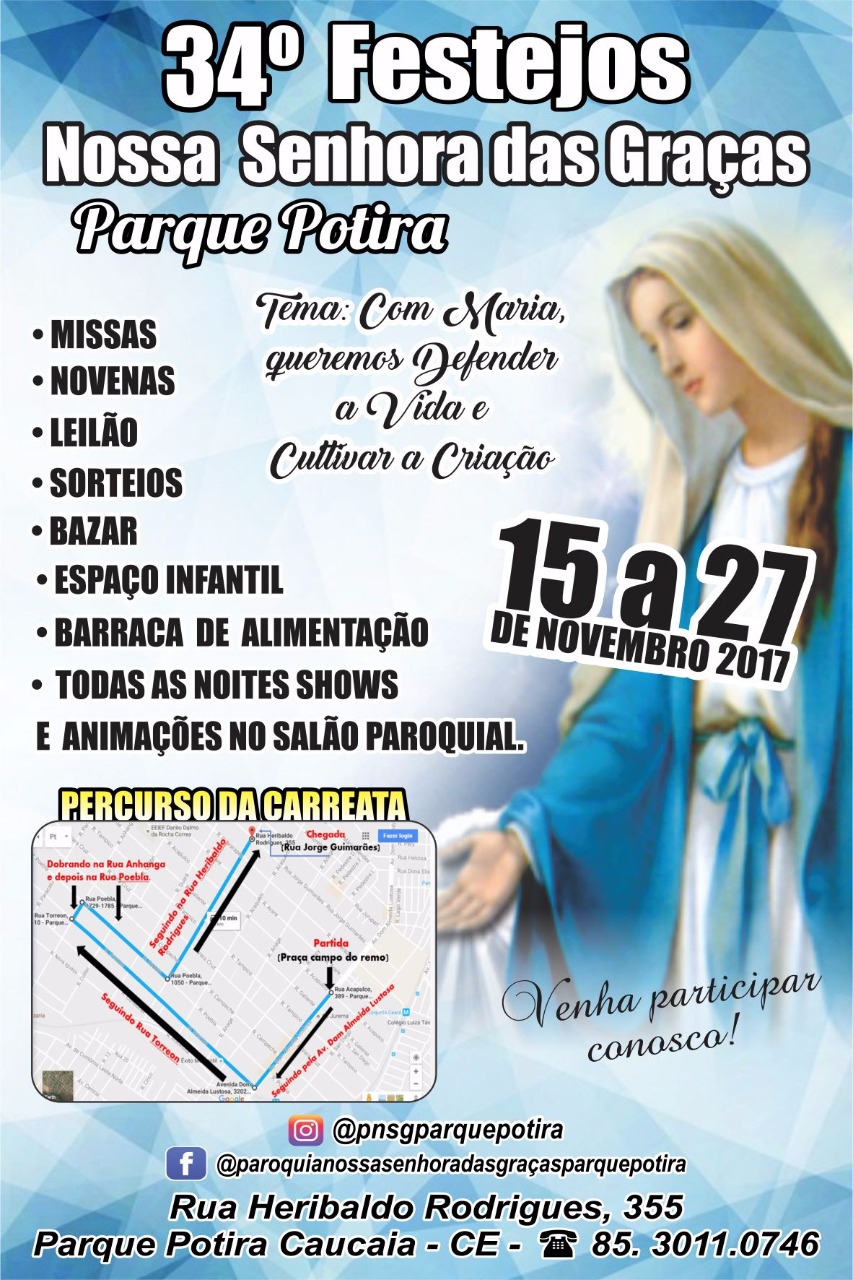 A Paróquia Nossa Senhora das Graças, no Parque Potira realiza de 15 a 27 de novembro a 34º Festa de sua padroeira tendo como tema “Com Maria, queremos Defender a Vida e Cultivar a Criação”. Durante os festejos, missas, novenas, leilão, sorteios, bazar, espaço infantil, barracas de alimentação, todas as noites shows e animações no salão paroquial.