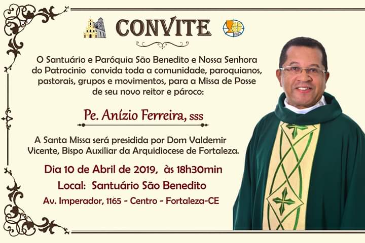 A Paróquia e santuário de São Benedito e Nossa Senhora do Patrocínio convida toda a comunidade, paroquianos, pastorais, grupos e movimentos para a Missa de Posse do seu novo reitor e pároco: Pe Anízio Ferreira, sss, e a apresentação do Pe. Joao Batista, sss como novo Vigário Paroquial, no dia 10/04/2019 às 18h30min, no Santuário de Adoração, com a presença do Superior Provincial Pe. Marcelo da Silva, sss.