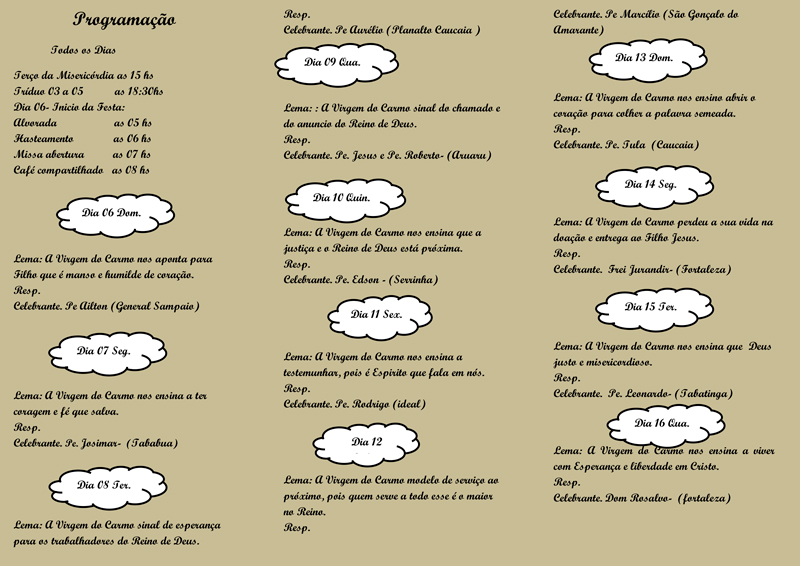 Dia 16 de julho, às 19h, missa presidida por Dom Rosalvo, bispo Auxiliar da Arquidiocese de Fortaleza – Tema: “A Virgem do Carmo nos ensina a viver com Esperança e liberdade em Cristo”.