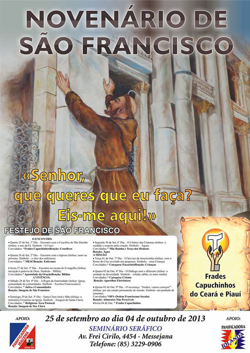 O novenário de São Francisco teve início ontem, dia 25 de setembro, e terminará no dia 4 de outubro de 2013 no Seminário Seráfico, na Av. Frei Cirilo, 4454 – Messejana- Fortaleza- Ce. Veja aqui toda a programação.