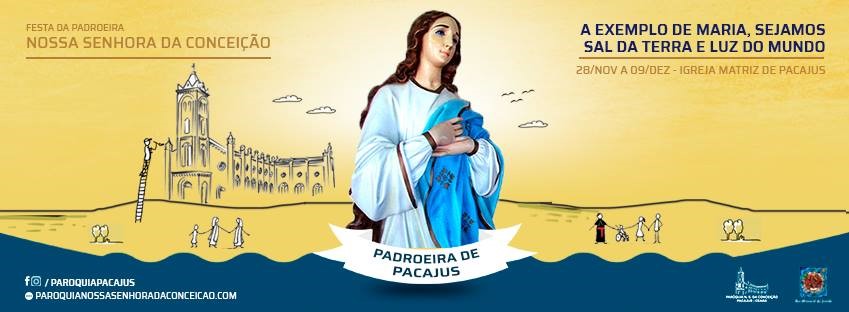 O povo de Deus em Pacajus celebra Nossa Senhora Conceição, sua defensora, no período de 28/11 a 09/12, a partir das 18h, com confissões, seguida de missa, na Igreja Matriz. “A exemplo de Maria, sejamos Sal da Terra e luz do mundo”, aponta o tema central. Na abertura, 28, às 18h, procissão e hasteamento das bandeiras. No convívio social não faltará animação com os artistas convidados, show de prêmios, sorteios, leilão e barracas com comidas. Acompanhe o novenário pelas redes sociais da Paróquia.