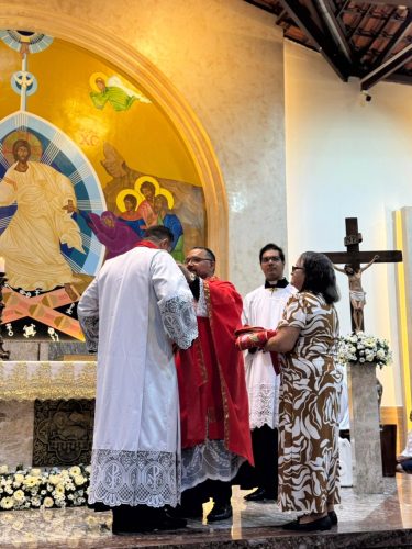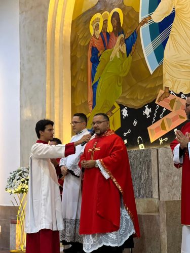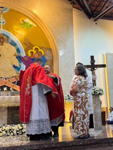 O rito prosseguiu com os gestos simbólicos próprios da posse canônica. O novo pároco recebeu o Evangeliário e proclamou a Palavra de Deus. Após a homilia, recebeu a chave do sacrário, o óleo dos catecúmenos e a estola roxa, sinais do cuidado pastoral, da missão de santificar, reconciliar e acompanhar o povo de Deus que lhe foi confiado.