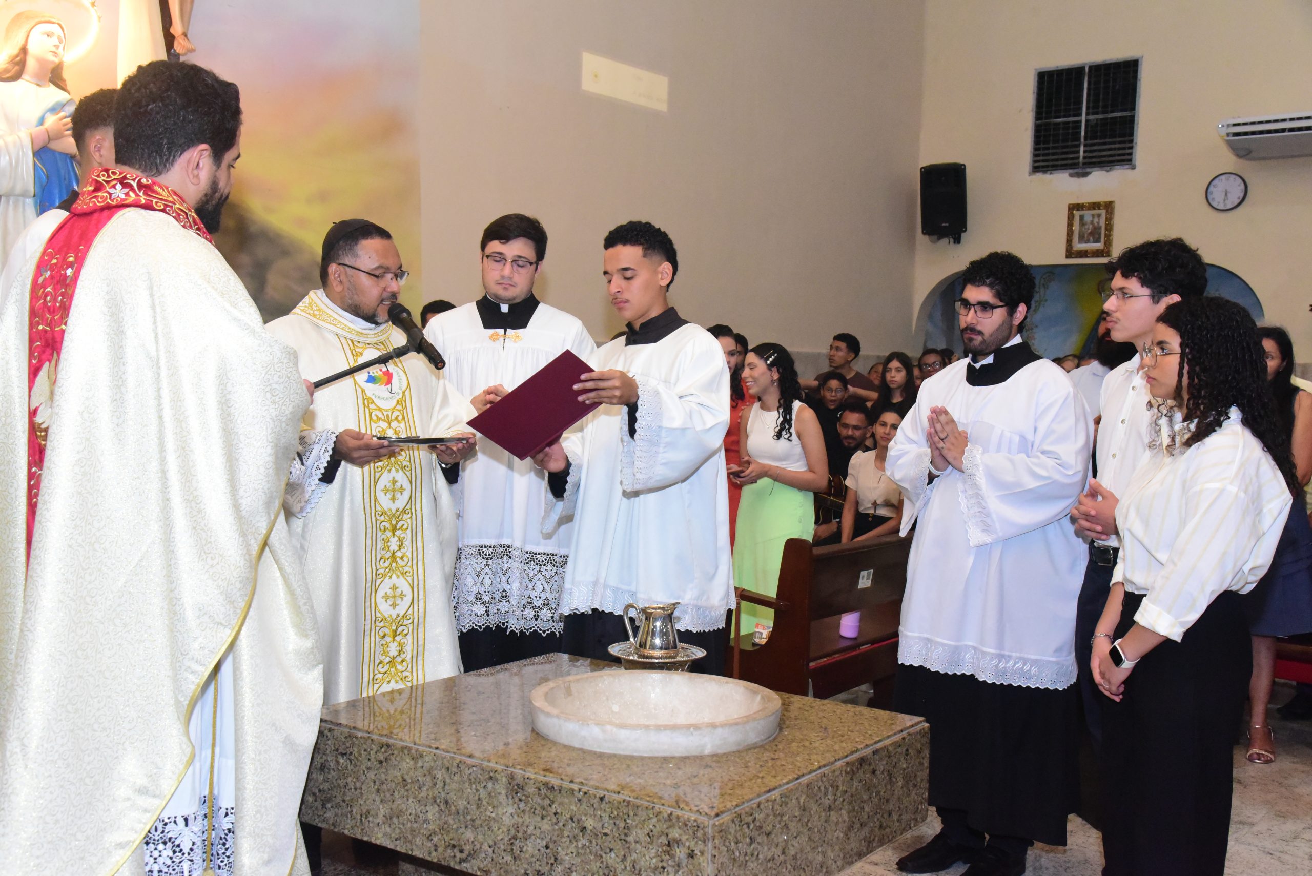 Após a saudação inicial, foi realizada a leitura da provisão de nomeação, documento oficial do arcebispo, proclamado pelo Padre James Wilson Januário de Oliveira, SDS. A provisão, datada de 1º de fevereiro de 2026, confirmou oficialmente o Padre Samuel Alves da Cruz, SDS, como pároco da Paróquia Imaculada Conceição e São João XXIII, acolhendo-o juridicamente e pastoralmente na missão confiada.