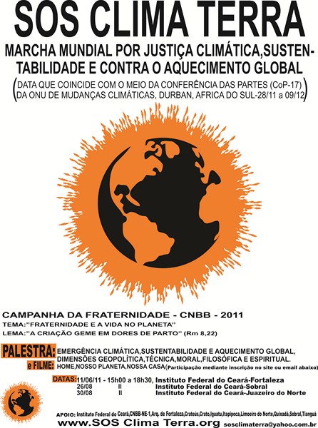 A Conferência Nacional dos Bispos do Brasil, Regional NE 1, Arquidiocese de Fortaleza, Dioceses do Estado do Ceará, o Instituto Federal de Ciência e Tecnologia do Ceará e SOS CLIMA TERRA- Campanha Mundial por Justiça Climática, Sustentabilidade e Contra o Aquecimento Global – promovem, dentro da Campanha da Fraternidade 2011, cujo tema é “Fraternidade e Vida no Planeta”, a palestra: “Emergência climática, Sustentabilidade e Aquecimento Global – dimensões geopolítica, técnica, moral, filosófica e espiritual”, a realizar-se no dia 11 de junho, das 15h às 18h30, no Auditório Castelo Branco – Instituto Federal de Ciência e Tecnologia do Ceará. Na palestra, haverá projeção do filme “Home, Nosso Planeta, Nossa Casa”, do diretor Bertrand.
