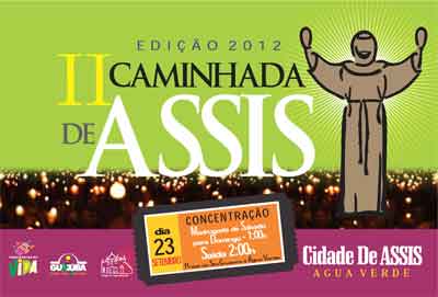 A Paróquia Jesus, Maria e José, no município de Guaiúba, na Região Metropolitana de Fortaleza, realizará, em ação conjunta com o Projeto Territórios de Vida, a II edição da CAMINHADA DE ASSIS 2012 – um caminho de paz! no próximo dia 23 de setembro, com concentração na praça do Santo Cruzeiro, na madrugada de sábado para domingo, à 1 hora, com animação, alongamento e oração. A saída será às 2 horas para o distrito de Água Verde. Serão 14 km de caminhada com muita disposição e fé.