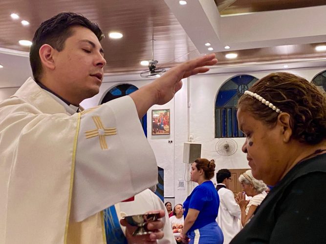 A Santa Missa foi presidida pelo pároco, Pe. Rafhael Maciel, e concelebrada pelos vigários paroquiais, Pe. Dyrles Marques e Pe. Augusto Brasileiro, que juntos conduziram a assembleia a um profundo momento de fé, confiança e entrega.