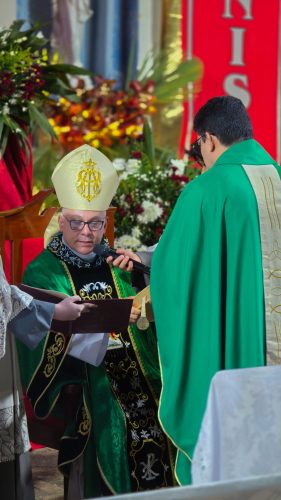 Durante o rito próprio da posse, Padre Denis realizou a Profissão de Fé e o Juramento de Fidelidade, comprometendo-se com o arcebispo e com a Igreja. Em seguida, recebeu das mãos de Dom Gregório importantes sinais de sua missão pastoral: o Evangeliário, a chave do sacrário da Igreja Matriz, o óleo dos catecúmenos e a estola roxa, símbolos do serviço pastoral confiado ao pároco.