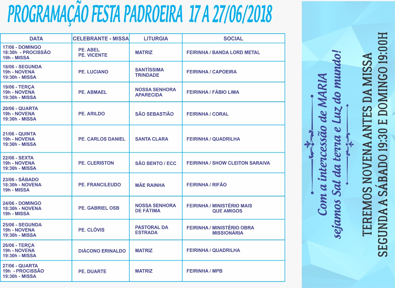 19h30min – Celebração da Palavra com o Diácono Erinaldo animada pela Igreja Matriz.