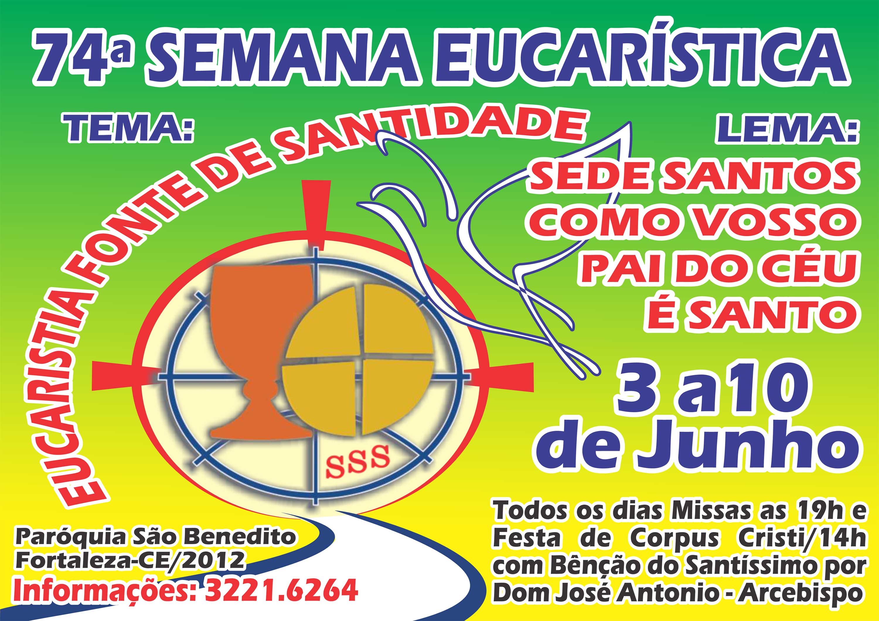 O tema da 74ª. Semana Eucarística da Paróquia São Benedito é “Eucaristia fonte de santidade”. E o lema “Sede santos como vosso pai do céu”. Acontece de 3 a 10 de junho com missa todos os dias às 19 horas. No dia 7, Corpus Christi, a celebração terá inicio ás 14 horas com a benção do Santíssimo por dom José Antonio Aparecido Tosi Marques, Arcebispo Metropolitano.