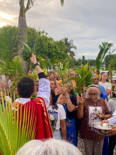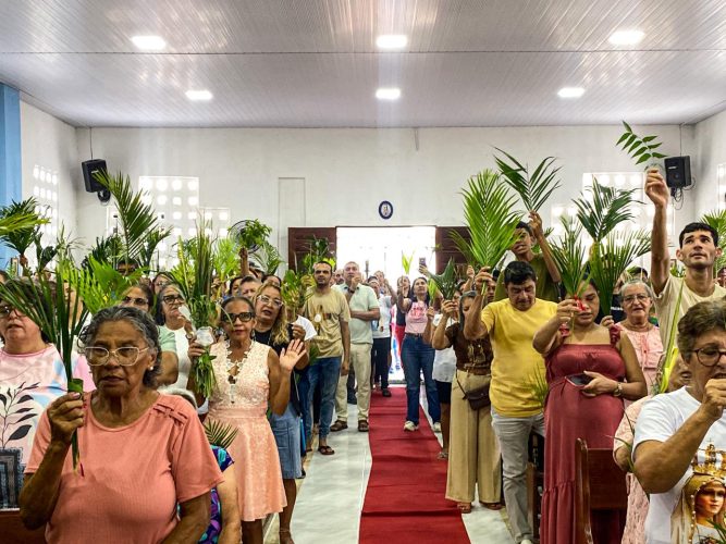 Ao longo do dia, duas Santas Missas reuniram centenas de fiéis que, com ramos nas mãos e o coração cheio de fé, fizeram memória da entrada triunfal de Nosso Senhor Jesus Cristo em Jerusalém, aclamando-O como Rei, mas também já se preparando para contemplar o mistério de Sua Paixão, Morte e Ressurreição.