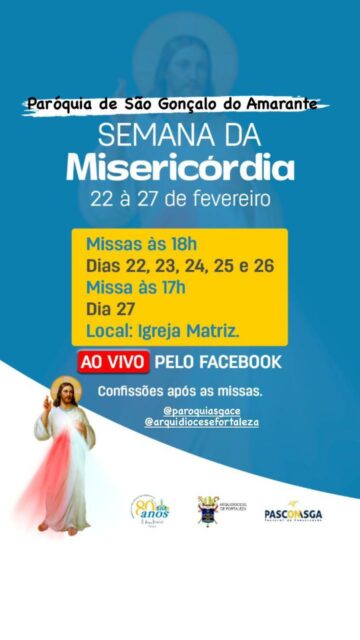 A Paróquia de São Gonçalo do Amarante está realizando desde o dia 22 e prossegue até 27 de fevereiro, a Semana da Misericórdia com Santa Missa às 18h e no encerramento, dia 27, às 17h. Acompanhe a programação pelo Facebook paroquial. Após a Santa Missa confissões para quem desejar.