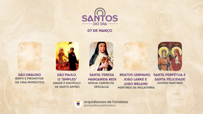 Santa Perpétua e Santa Felicidade foram jovens mártires romanas. Santa Felicidade era empregada da família de Santa Perpétua. Ambas foram presas e condenadas à morte, pois um édito imperial proibia a conversão ao Cristianismo. Santa Perpétua estava grávida e deu à luz dias antes de sofrer o martírio. Santa Felicidade era casada e tinha um filho pequeno. Por amor a Cristo, renunciaram às famílias e à vida cômoda, mantendo-se fiéis ao Evangelho. Foram jogadas na arena, penduradas em uma rede, estraçalhadas pelos chifres de uma novilha e, em seguida, decapitadas. Sofreram o martírio em 7 de março de 203.