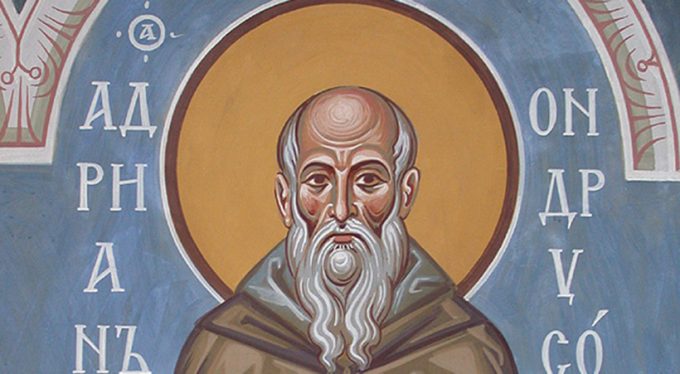 Santo Adriano era abade beneditino, africano, e viveu em Nápoles, na Itália. Apesar de ter sido escolhido para ser arcebispo de Cantuária, na Inglaterra, declinou da indicação e permaneceu em Cantuária como monge, chegando a ser abade do mosteiro beneditino dessa cidade inglesa. Santo Adriano faleceu no ano de 710.