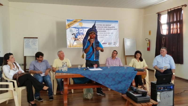 Emocionado Weibe Tapeba, da Coordenação dos Povos Indígenas do Estado do Ceará, lembrou a pessoa de Dom Aloísio Lorscheider e o seu apoio e trabalho junto as comunidades indígenas do Ceará. Depois de ter também lembrado as visitas de Dom Cláudio Hummes, deixou um convite para Dom José Antonio, arcebispo de Fortaleza. Disse “A missão da Igreja vai ser perpétua, pois enquanto tiver um homem querendo ser maior que outro e desrespeitando a sua dignidade não haverá fim. Para nós é imprescindível a presença e ajuda da Igreja e do CDPDH na luta pela demarcação das terras das comunidades dos povos indígenas do Estado do Ceará. Por isso, quero convidar a Igreja e Dom José Antonio para nos visitar também, pisar o chão de nossa aldeia, cantar e dançar o Toré conosco”.