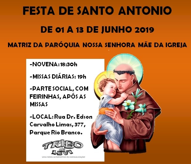 A Paróquia Nossa Senhora Mãe da Igreja, nos bairros Parque Rio Branco e Presidente Kennedy realiza, de 1º a 13 de junho os festejos de Santo Antônio de Pádua. A oração da Trezena em honra ao Santo doutor da Igreja tem início às 18h30min, seguida de Missa às 19h, e parte social após a celebração com diversas atrações.