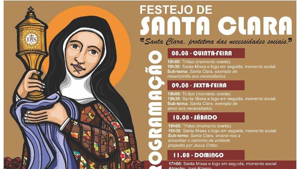 A Paróquia da Maraponga realiza festejos a Santa Clara com o Tríduo, de 8 a 12 de agosto, partir das 19h, na Capela Santo Inácio de Loyola com tema “Santa Clara, protetora das necessidades sociais”. A capela fica na Rua Clemente Silva, 725 no bairro Mondubim.