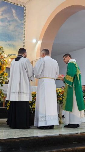Antes da aclamação do Evangelho, o Pe. Adair foi revestido com as vestes sacerdotais pelas mãos de Dom José, em um gesto carregado de simbolismo, recordando que, anos atrás, naquela mesma Igreja, ele realizou as sua primícias sacerdotais.